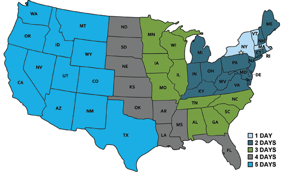 Our shipping is done with UPS. Check this chart for estimated shipping time.